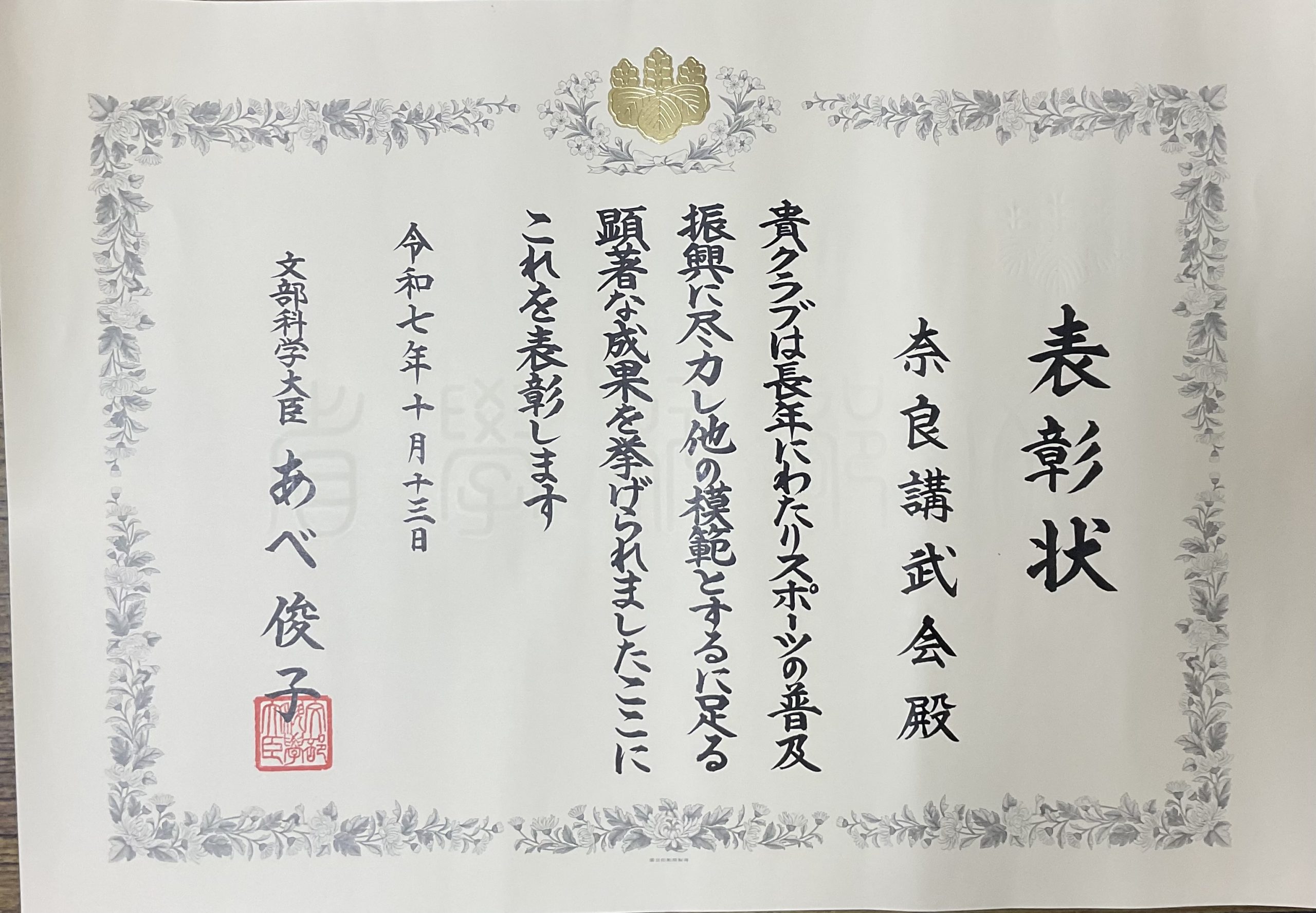 このたび、奈良講武会は文部科学省より『生涯スポーツ優良団体』として表彰を受けました。